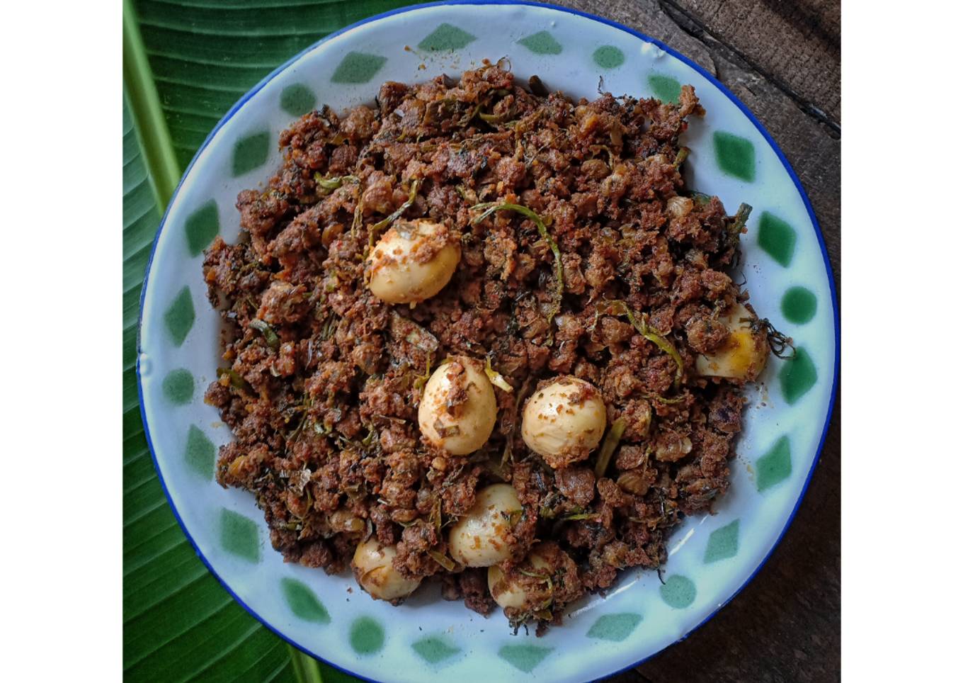 - Setelah mendidih masukkan telor puyuh. Aduk sampai keluar minyak santan. Kecilkan api kompor.