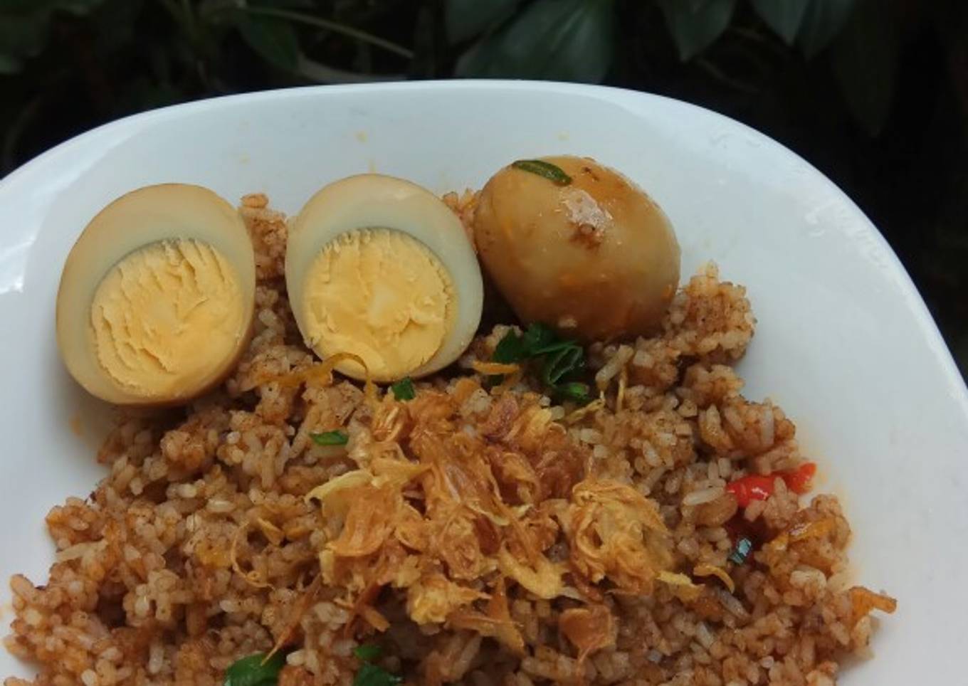 - Setelah wangi, masukkan nasi, oseng sebentar, kemudian masukkan rendang telur dan bumbu rendangnya.
