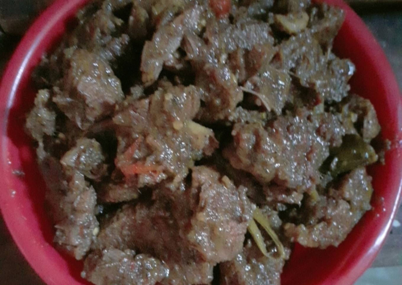 - Jika sudah diberi santan sering2 di aduk2 daging sampai bener2 daging empuk dan benar2 sat air nya dan kering... jika sudah sat dan kering matikan kompor lalu pindahkan daging pd wadah laen..