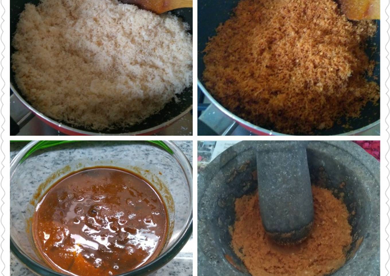 - Setelah kelapa sangrai kering dan kecoklatan (bukan coklat gosong), matikan api dan tumbuk sedikit-sedikit sampai halus dan wajib sampai keluar minyaknya.