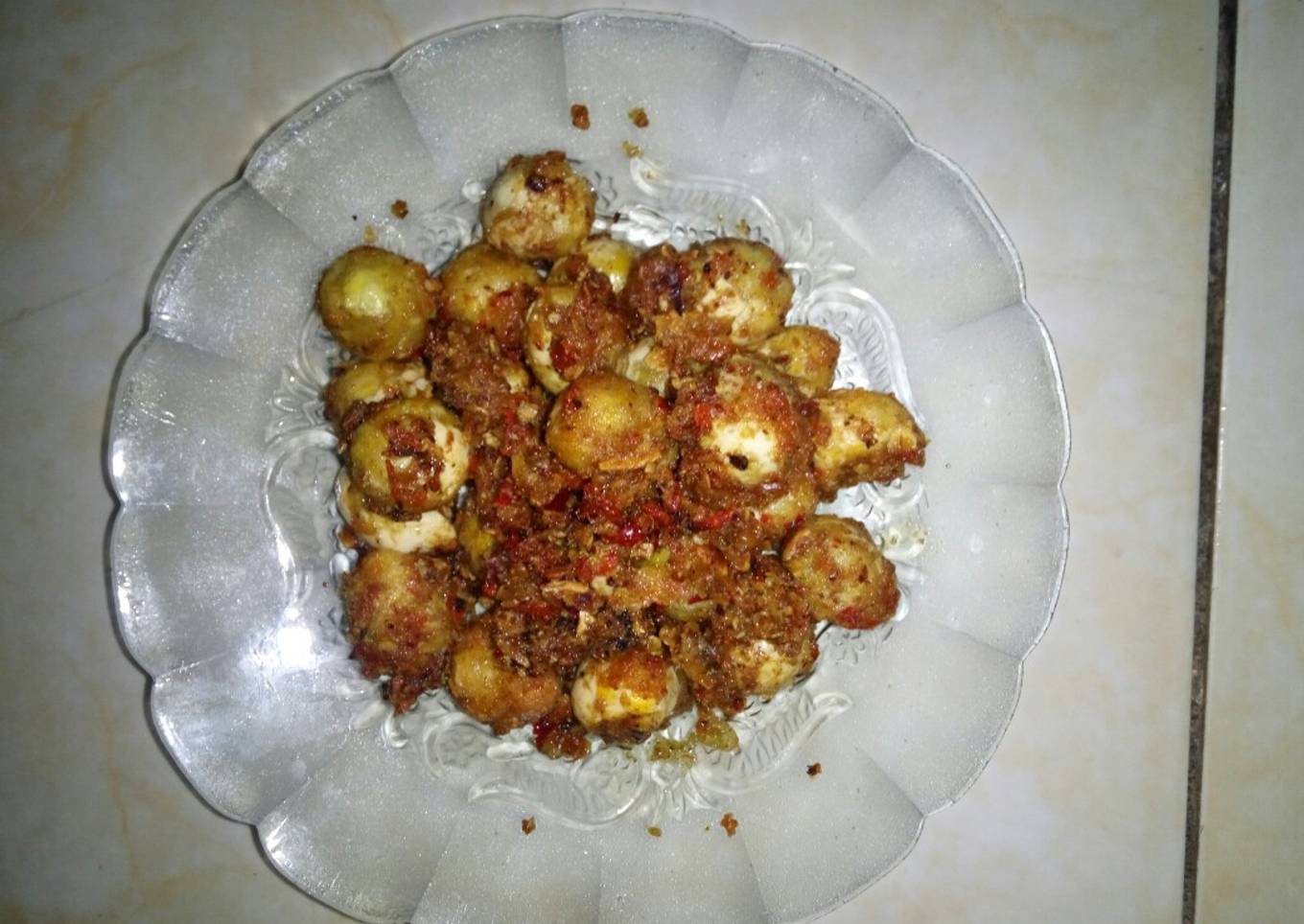 - Kupas telur puyuh rebus dan goreng sampai agak kering