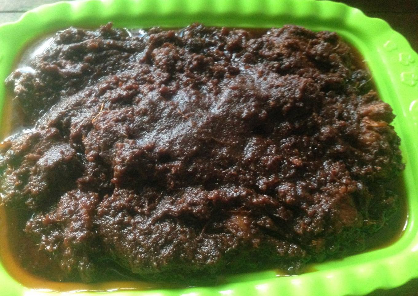 - Campur jadi satu dalam kuali santan encer, daging, cabe merah keriting giling halus, serai, daun salam, daun kunyit, daun jeruk purut, kaldu instant dan bumbu yang sudah dihaluskan tadi, aduk rata dan masak dengan api sedang hingga daging empuk sambil sesekali diaduk. Kalo daging masih keras, bisa ditambahkan air dan masak kembali hingga daging empuk.